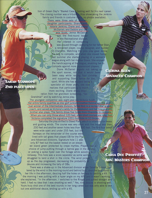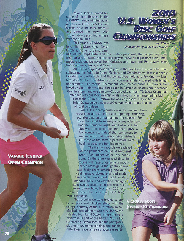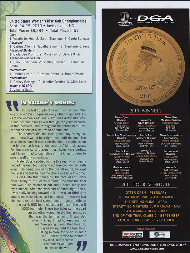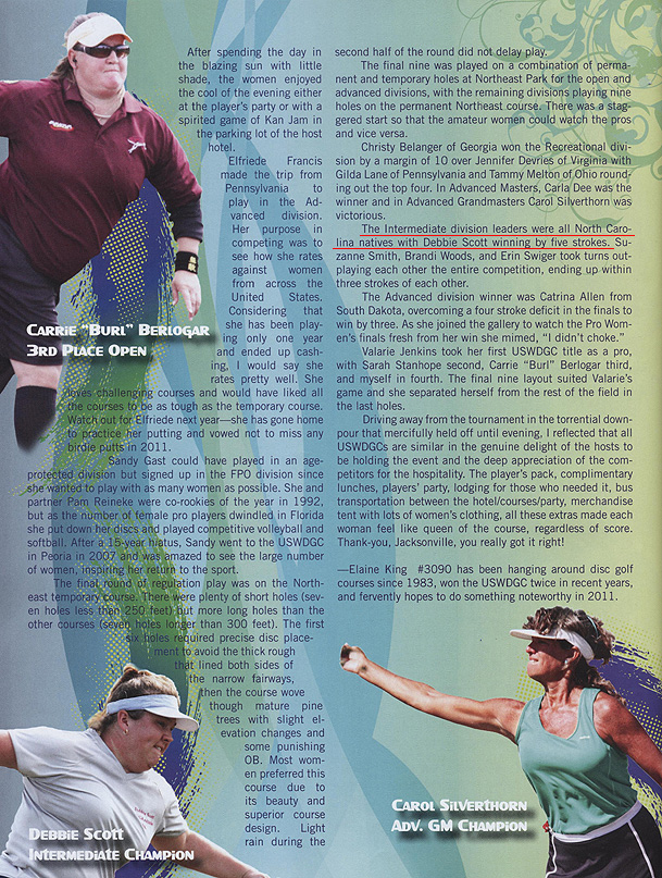 The Winter 2011 issue of discgolfer magazine included an article for the 2010 US Women's Championship: