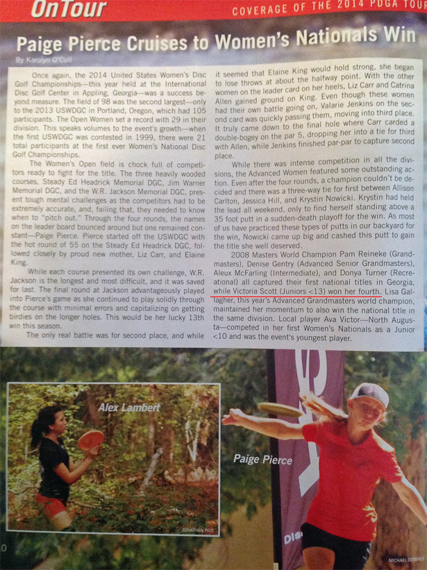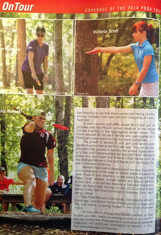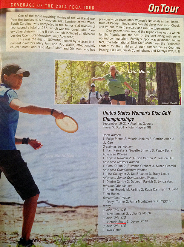 The Winter 2015 issue of discgolfer magazine included an article for the 2014 US Women's Championship: